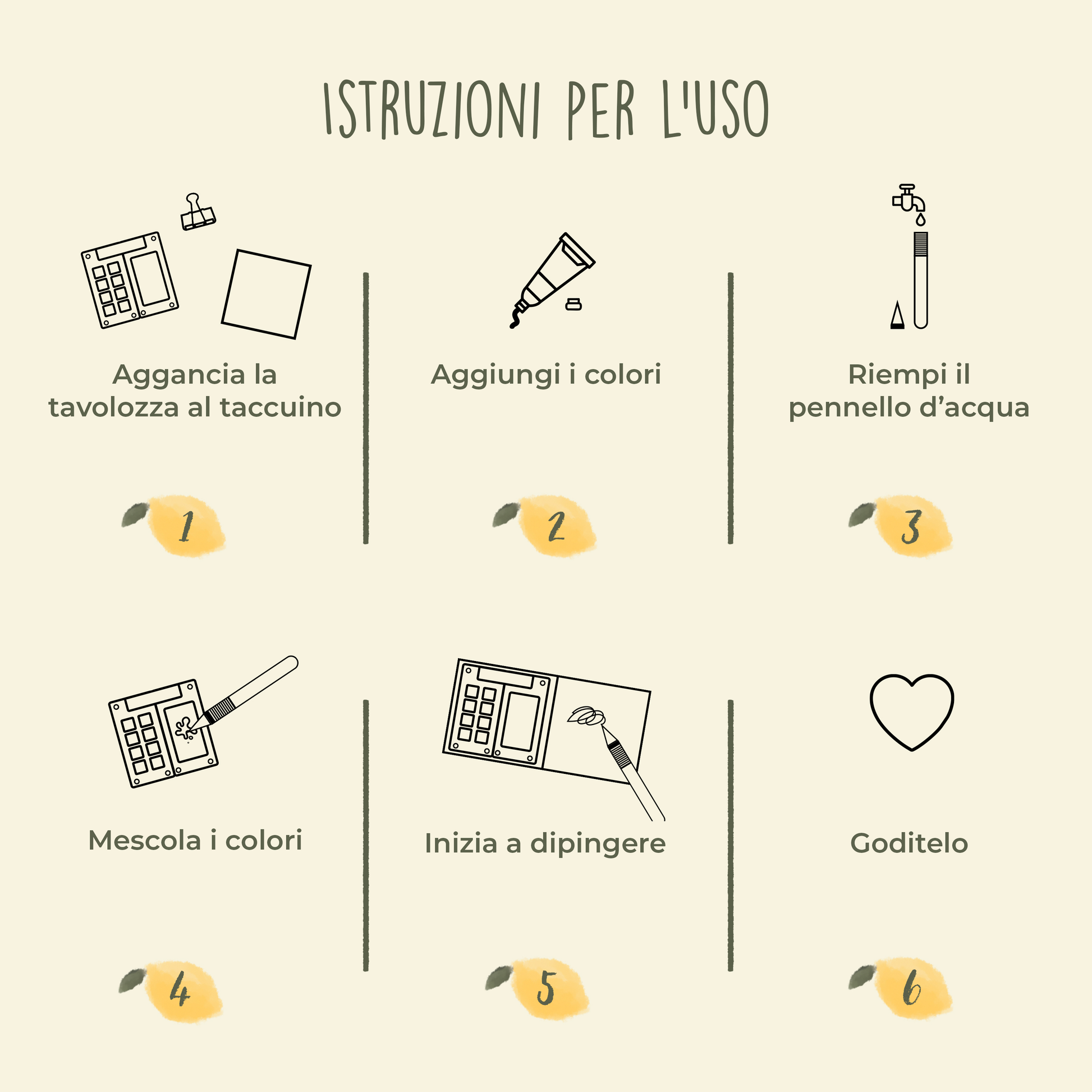 Il set è ben pensato. Ci sono abbastanza colori, i pennelli ad acqua sono molto comodi. Consiglio di ordinare subito pennelli extra di dimensioni diverse. Anche la borsa. Sta in una borsetta o in uno zainetto. La mini tavolozza può essere facilmente fissata al mini blocco di carta per acquerello mentre si dipinge. È divertente trasformarlo gradualmente in un libro illustrato. Dopo aver dipinto la copertina, l’ho fissata con una vernice opaca per proteggerla dall'usura durante il trasporto. Non avrei mai pensato di divertirmi così tanto a dipingere su superfici così piccole.