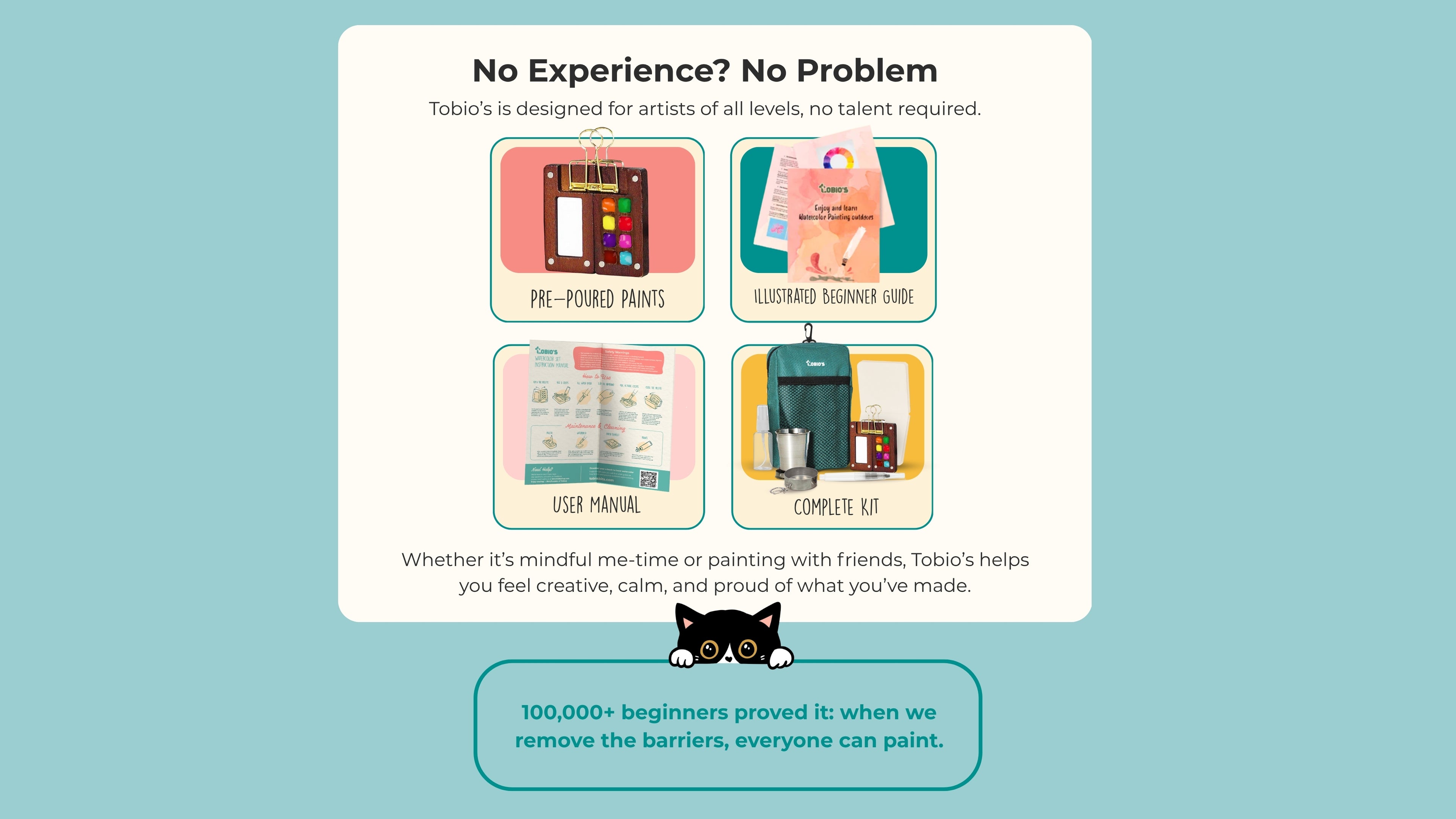 Tobio’s comes with a 60-day money-back guarantee. If you don’t feel calmer, more creative, and a little bit happier, we’ll do whatever it takes to make it right. Whether it’s additional support, personalized tips, or a full refund. No regrets, no stress.