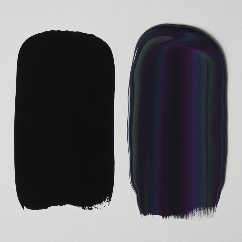 This black has the most depth because it contains all three primaries. Light interacts with it differently than with two-color blacks.