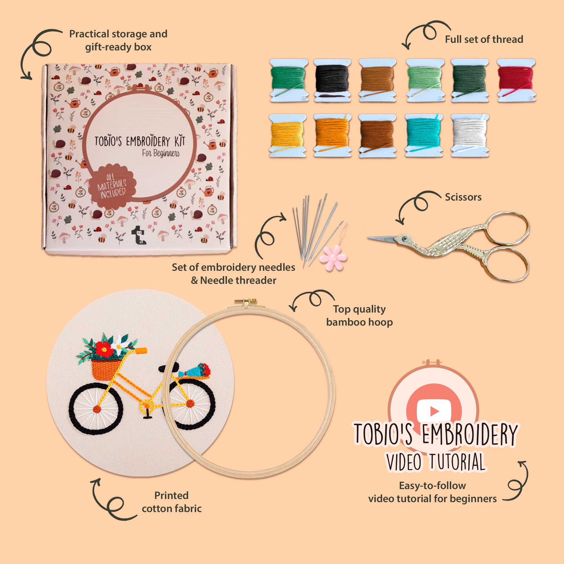 All our embroidery kits come with everything you need. Just follow the step-by-step video tutorials and the detailed printed instructions included in every kit.