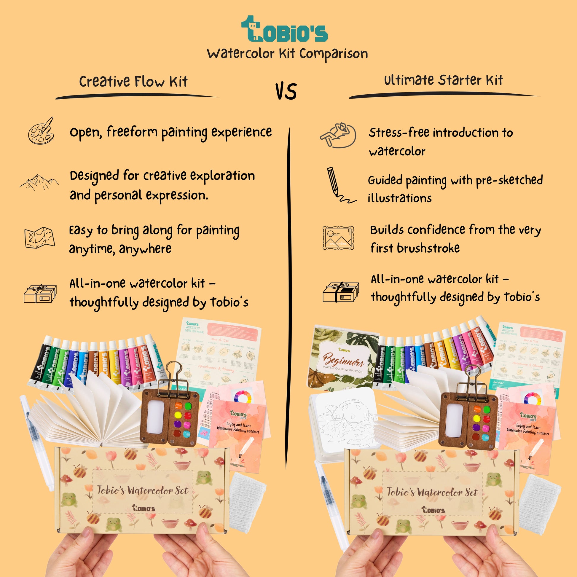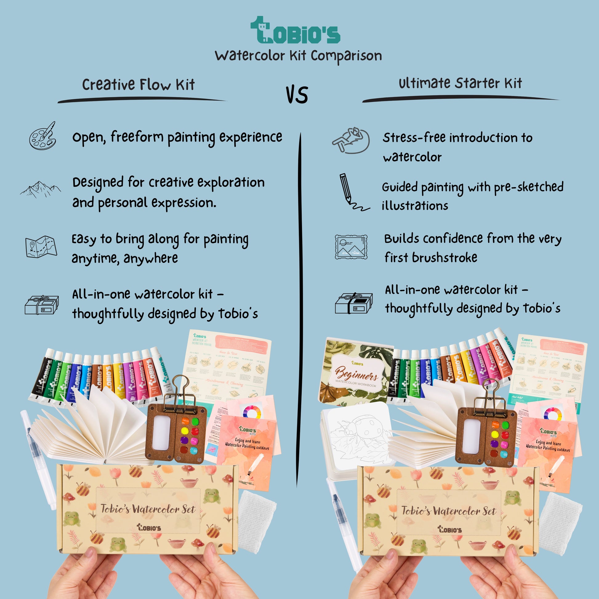 El Kit de Inicio Definitivo de Tobio es la solución ideal para iniciarse en la acuarela. Incluye ilustraciones pre-esbozadas que facilitan el inicio. Diseñado específicamente para quienes siempre han querido pintar, pero no saben por dónde empezar.
