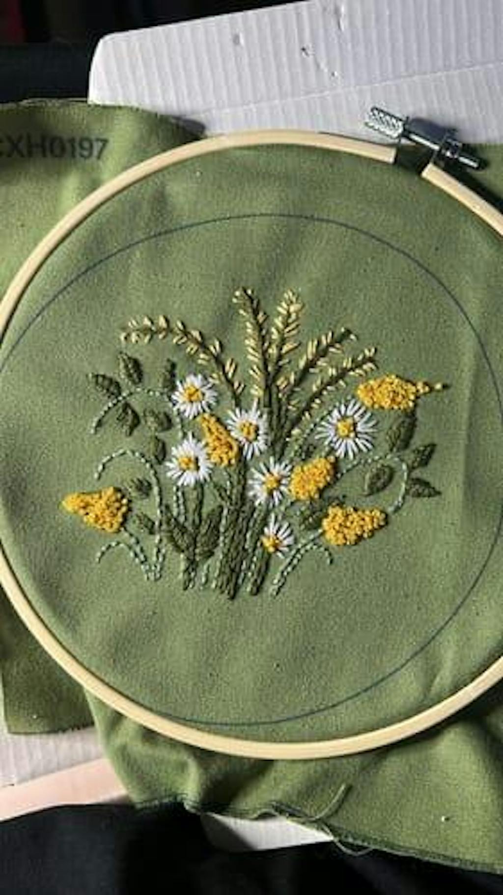 I loved attempting this as my first full piece. Im not very confident and just a beginner sadly I got carried away and didn’t change thread for leaves. I was too disheartened to unpick it all. I feel quite happy with it.