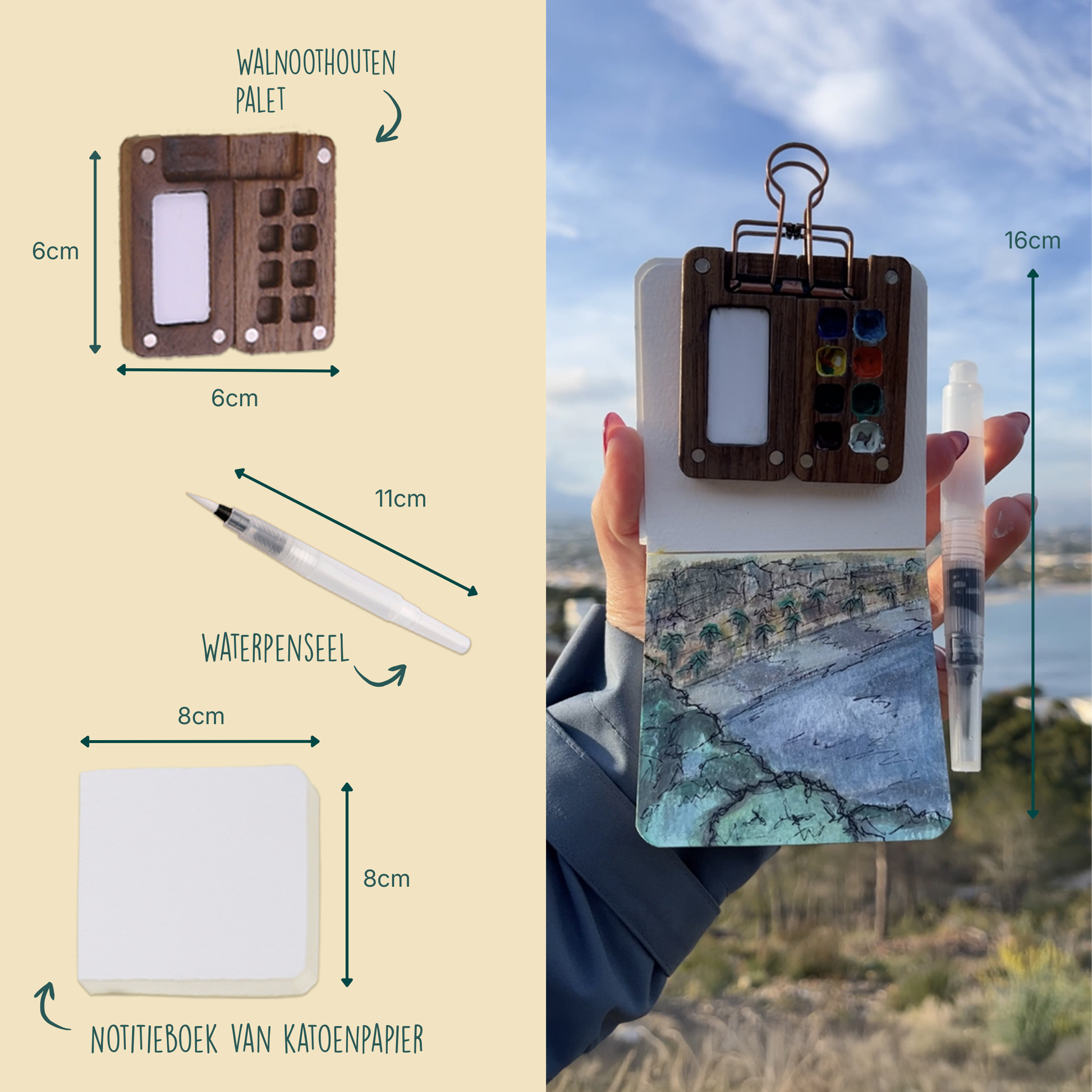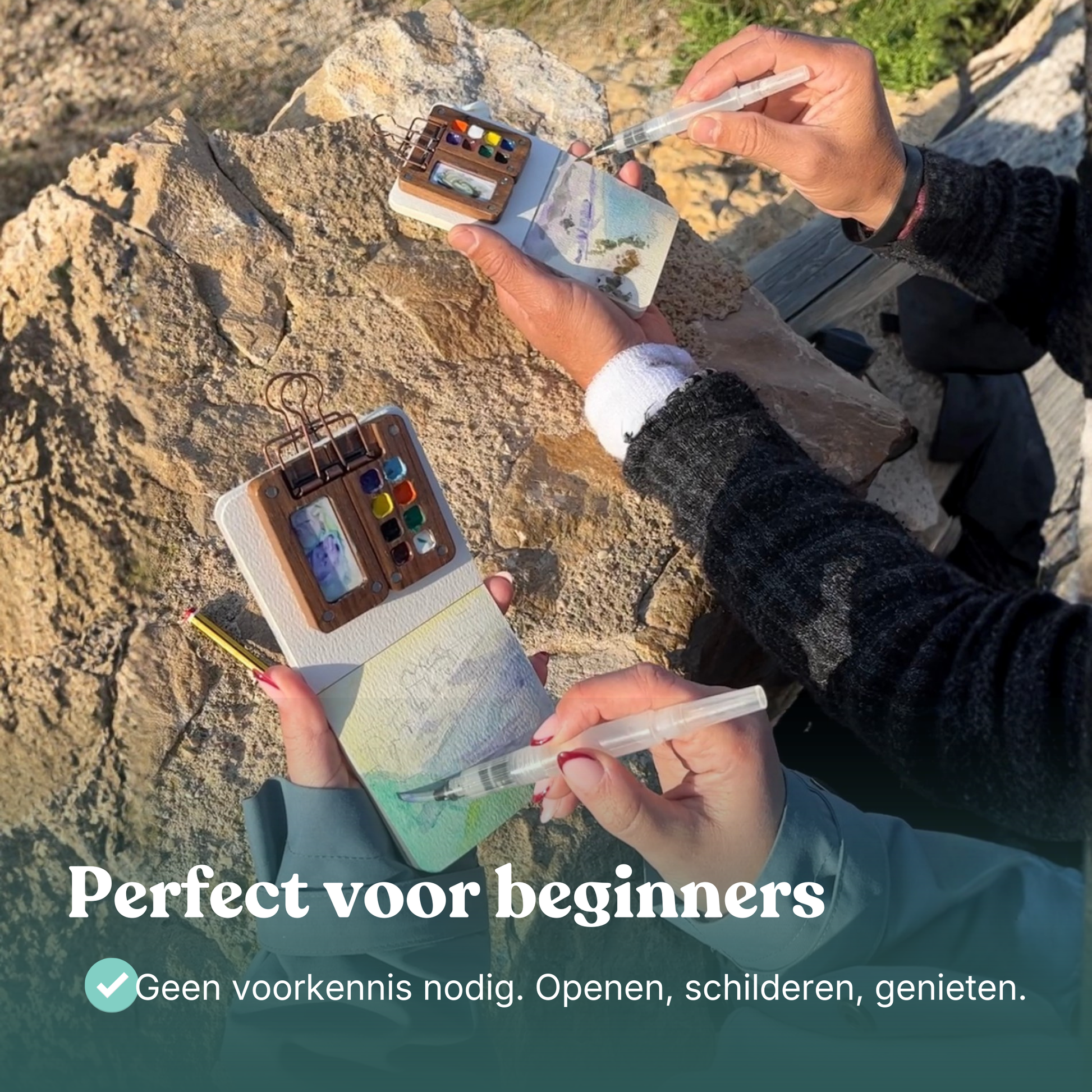 Geen voorbereidingen. Geen geknoei. Geen onbekenden die naar je staren. Daarom noemen veel mensen het een compacte waterverfset en een mini-waterverfreisset in één.