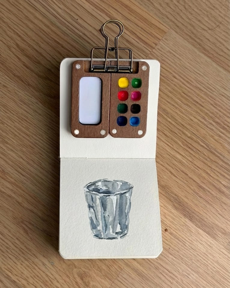 Idag skapar vi en metallisk akvarellmålning med noll metallisk färg. Vi gör en lös sketchbookstudie av en krossad silverkopp. Vi skapar illusionen av metall genom att använda högt kontrasterade grå toner och skarpa kanter. Detta är en 15-minuters övning i att lita på dina ögon, inte din hjärna.