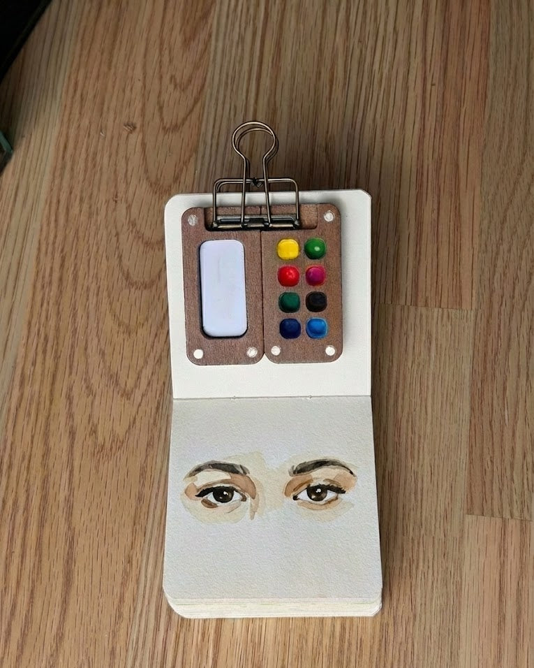 Idag gör vi en lös skissboksstudie. Vi ska ta oss an akvarellmålning av ögon på ett sätt som känns fräscht, illustrativt och mänskligt. Titta på bilden ovan – det handlar inte om att räkna ögonfransar; det handlar om att fånga blicken. Metoden är snabb (under 20 minuter), använder bara några färger och omfamnar vattnets svajiga natur.